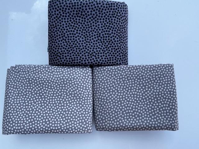 3 super flotte stoffer alle med uens prikker, en lysgrå, en grå og en sort