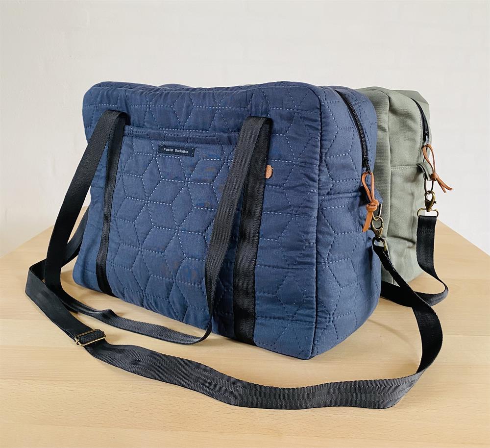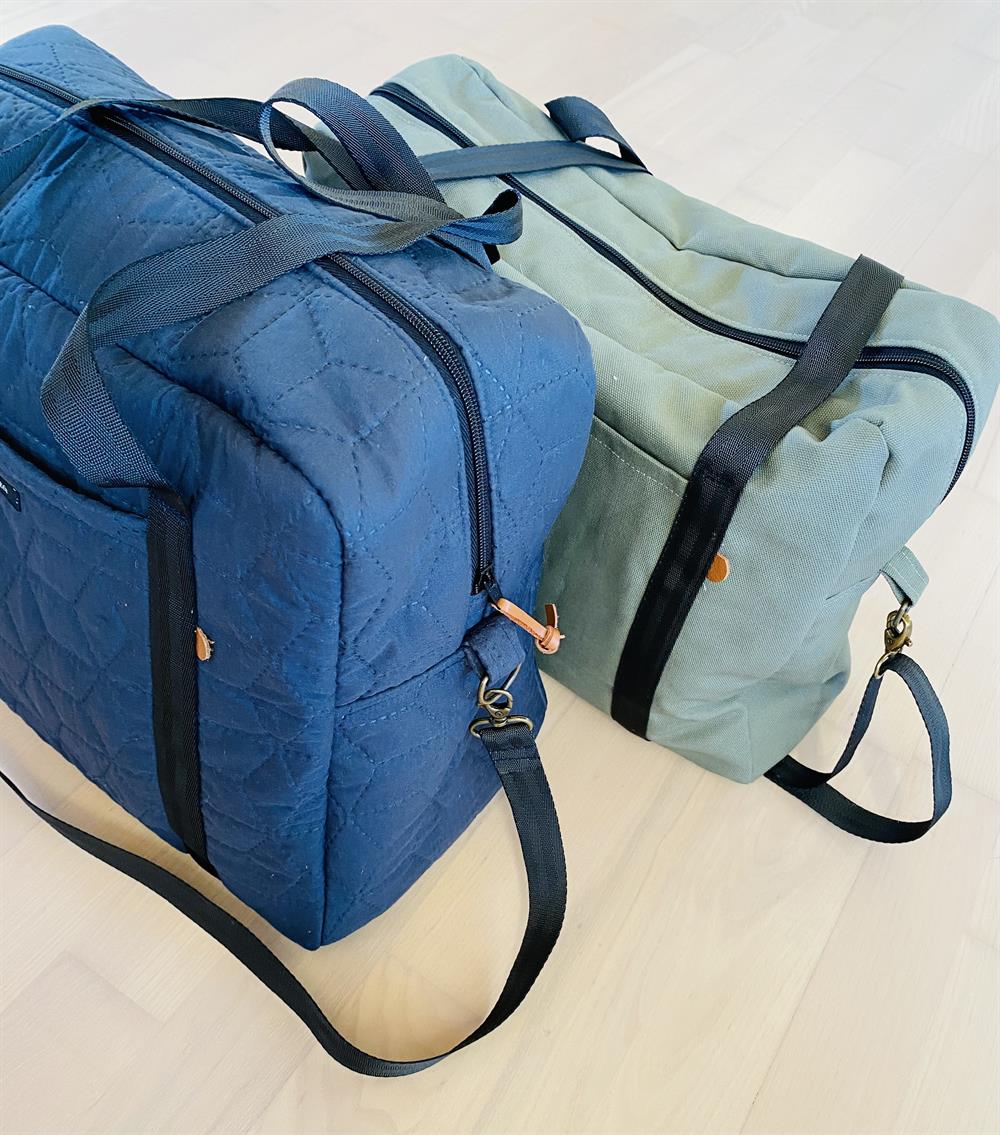 WeekendTasken findes i to størrelser: en rummelig/dyb(blå) og mindre rummelig/mindre(grøn) dyb model.