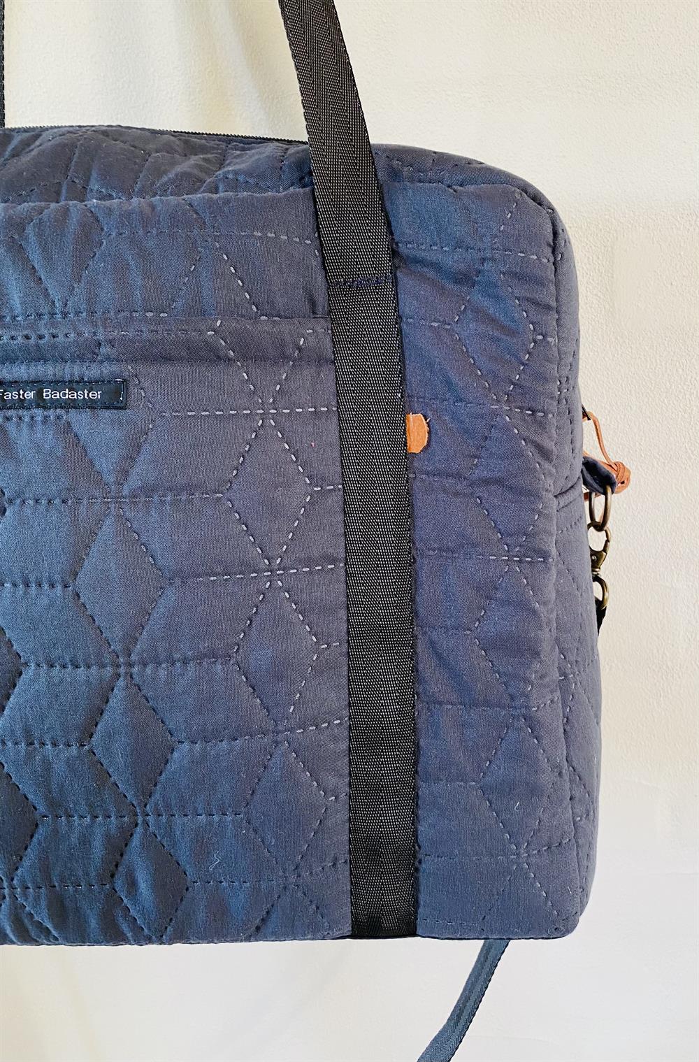 Quiltet stof/kraftigt stof til ydersiden, foer, mellemfoer – volumenvlies eller quilte skum, vandafvisende stof til bunden udvendigt, gjord, lynlås, D-ringe, krabinhager, regulaspænde, lædersnip, evt. lille karabinhage og læderstrimmel til indvendig nøglesnor