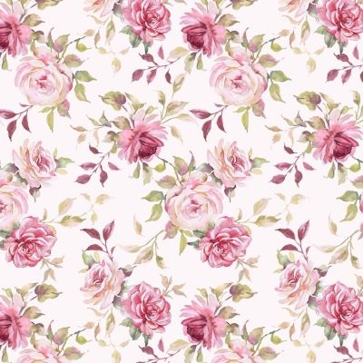 Dette meget smukke lyse patchwork stof har masser af meget smukke lyserøde roser med grønne blade.