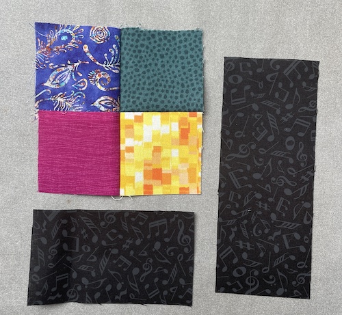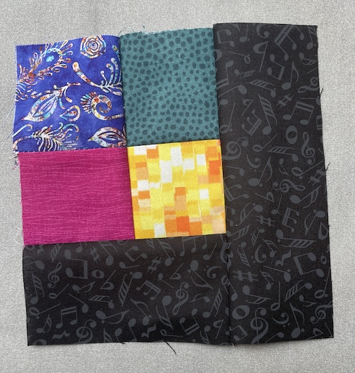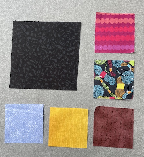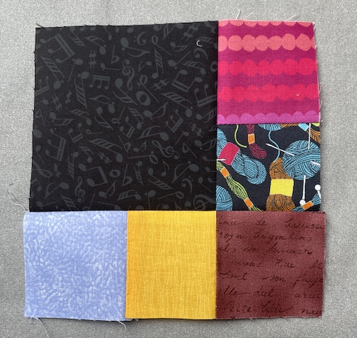 5 firkanter på hver 6 x 6 cm i reste farver,