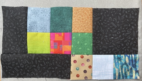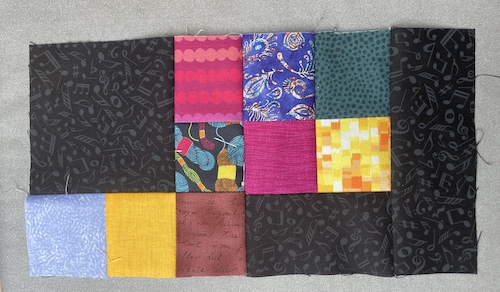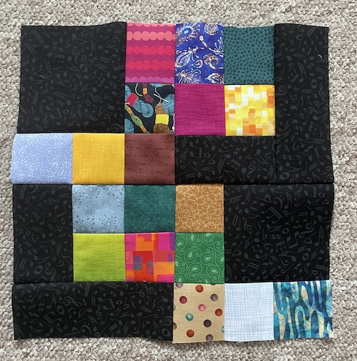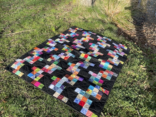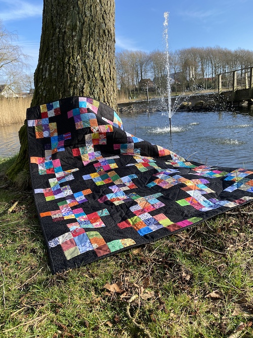Har quiltet diagonalt med en meleret quiltetråd diagonalt i de farvet firkanter of med sort i de sorte felter.